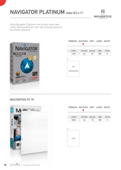 NAVIGATOR PLATINUM letter 8,5 x 11" Carta Navigator 75 grammi nel formato americano Letter. Resa perfetta per tutti i tipi di stampe grazie al suo elevato spessore. PREMIUM MULTIUSO COPY LASER INKJET codice formato peso gr fogli risme LC99 AS 75 500 5 AS american size MULTIOFFICE FIT 75 PREMIUM MULTIUSO COPY LASER INKJET codice formato peso gr fogli risme NQ18 A4 75 500 5 4 fori 18 | carte per informare