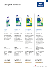 Detergenti pavimenti sgrassanti SIRPAV HC SIRPAV sgrassanti MATIC EXTRA MATIC FLOOR 1000 ml 5 L 5 L 5 L Cod. prodotto: 1421-S Cod. prodotto: 1422 Cod. prodotto: 1445 Cod. prodotto: 1440 Detergente ammoniacale Detergente universale Detergente non schiumogeno Detergente alcalino super sgrassante universale profumato, concentrato, per lavasciugapavimenti concentrato, formulato per profumato per il lavaggio ammoniacale, a schiuma supersgrassante la rimozione dello sporco di ogni superficie lavabile. controllata. Sgrassante fortemente pesante dai pavimenti. Sgrassa e deodora a fondo Sgrassa e deodora a alcalino non schiumogeno La bassa schiumosità lo senza lasciare aloni. fondo qualsiasi superficie super concentrato specifico rende perfetto per l’utilizzo senza lasciare aloni. per pavimenti ad alto in macchine lavasciuga, Particolarmente indicato per traffico quali: supermercati, senza dover aggiungere rimuovere sporchi alimentari. magazzini, parcheggi l’antischiuma. Pulisce lo interni e esterni, industrie sporco più difficile lasciando alimentari ecc. le superfici gradevolmente profumate. impiego: impiego: impiego: impiego: pavimenti e le superfici codice: 1410 tutte le superfici dure tutte le superfici dure pavimenti e le superfici dure lavabili con macchine lavabili lavabili dure lavabili lavasciuga. codice EAN 8032680392337 codice EAN 8032680392818 codice EAN 8032680395895 codice EAN 8032680391187 collo 6pz x 1000 ml collo 2pz x 5 L collo 2pz x 5 L collo 2pz x 5 L colli/strato 21 colli/strato 18 colli/strato 18 colli/strato 18 colli/pallet 105 colli/pallet 72 colli/pallet 72 colli/pallet 72 pezzi/pallet 630 pezzi/pallet 144 pezzi/pallet 144 pezzi/pallet 144 codice: 1445 codice: 1426N-S codice: 1425 codice: 1480 | prodotti per l'igiene 167 codice: 2023 codice: 1814 codice: 2080 codice: 2019 codice: 1130 codice: 1520N-S codice: 2120 codice: 1540N-S 61 61 codice: 1822-S codice: 2410 codice: 1560-S codice: 1562-S codice EAN: 8032680392009 codice EAN: 8032680392535 codice EAN: 8032680393167 codice EAN: 8032680399121 confezione: 6pz x ml 750 confezione: 2pz x Kg 5 confezione: 6pz x ml 750 confezione: 6pz x ml 1000