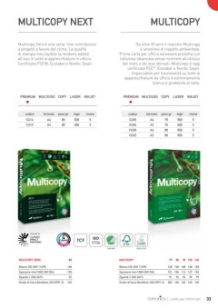 MULTICOPY NEXT MULTICOPY Multicopy Zero è una carta "che contribuisce Da oltre 35 anni il marchio Multicopy a progetti a favore del clima. La qualità è sinonimo di rispetto ambientale. di stampa ineccepibile la rendono adatta Prima carta per ufficio ad essere prodotta con all'uso in tutte le apprecchiature in ufficio. cellulosa sbiancata senza ricorrere all’utilizzo Certificata FSC®, Ecolabel e Nordic Swan. del cloro o dei suoi derivati, Multicopy è oggi certificata FSC , Ecolabel e Nordic Swan. ® Impeccabile per funzionalità su tutte le apparecchiature da ufficio è estremamente bianca e gradevole al tatto. PREMIUM MULTIUSO COPY LASER INKJET PREMIUM MULTIUSO COPY LASER INKJET codice formato peso gr fogli risme codice formato peso gr fogli risme CU14 A4 80 500 5 CU05 A4 75 500 5 CU15 A3 80 500 3 CU06 A3 75 500 5 CU20 A4 80 500 5 CU22 A3 80 500 3 Una carta premium che sostiene l'azione per il clima Multicopy NEXT Ogni passo avanti è importante, anche il più piccolo. Come scegliere una carta da stampa che contribuisce all'azione per il clima. Con Multicopy NEXT, vogliamo ispirarti a fare quel passo in più insieme a noi. Perché Multicopy NEXT è la carta pensata per le generazioni future. Climate Impact Partners Partnership Come parte dell'impegno di Sylvamo nella riduzione delle emissioni di gas serra, l'azienda condivide l'impronta di carbonio della carta Multicopy NEXT, gli obiettivi di riduzione delle emissioni e i progetti climatici supportati in collaborazione con Climate Impact Partners. 344 044 SE/011/01 Collaborazione MULTICOPY ZERO 80 MULTICOPY 75 80 90 100 160 con Climate Impact Partners Bianco CIE (ISO 11475) 168 Bianco CIE (ISO 11475) 168 168 168 168 168 La carta Multicopy NEXT supporta due progetti di azione per il clima: la riforestazione comunitaria in Ghana Spessore mm/1000 (ISO 534) 105 Spessore mm/1000 (ISO 534) 101 105 116 127 196 e l'afforestazione delle terre degradate in Uruguay. Opacità % (ISO 2471) 92 Opacità % (ISO 2471) 91 92 94 95 99 Grado di liscio Bendtsen (ISO 8791-2) 160 Grado di liscio Bendtsen (ISO 8791-2) 200 160 160 160 160 | carte per informare 33 Per maggiori informazioni sui progetti, sull'impronta di carbonio della carta Scopri di più e sugli obiettivi di riduzione delle emissioni di gas serra di Sylvamo, visita questo link. Vantaggi del prodotto Carta senza problemi Multicopy NEXT è una carta premium facile da usare, con ottime prestazioni di stampa, ideale per tutti i tipi di macchine da ufficio. Ogni foglio viene aspirato per rimuovere la polvere, evitando inceppamenti o altri problemi. Risultati nitidi Premium in ogni dettaglio ® Multicopy NEXT è dotata della tecnologia Multicopy NEXT è certificata FSC , ColorLok , che garantisce colori vividi, neri con fibre provenienti esclusivamente ® più intensi, testo più definito e inchiostri a da foreste gestite in modo sostenibile. asciugatura rapida per una qualità di stampa superiore. Rispetta lo standard ISO 9706 per le carte permanenti, assicurando che Multicopy NEXT è disponibile la leggibilità e la qualità rimangano costanti nei formati A4 e A3. nel tempo. Dal legno alla carta e oltre. La carta Multicopy è prodotta a Nymolla (Svezia), in una cartiera integrata dove gestiamo direttamente il processo di produzione della cellulosa e della carta, dalla legna alla carta, all'interno dello stesso stabilimento. In collaborazione con l'azienda energetica nordica Gasum, trasformiamo i residui dell'acqua di processo in carburante privo di fossili, biogas liquefatto (LBG). Per ulteriori informazioni, visita il nostro sito web NORDIC SWAN ECOLABEL multicopy.co COPY AND PRINTING PAPER EU Ecolabel : 3044 0044 SE/011/001 Multicopy ® è un marchio registrato di Sylvamo Corporation. Tutti i diritti riservati. Forest Stewardship Council ® , FSC ® e il logo FSC sono marchi registrati di Forest Stewardship Council, A.C.