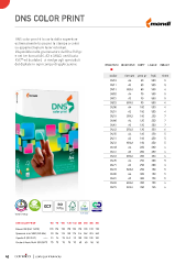 DNS COLOR PRINT DNS color print è la carta dalla superficie estremamente liscia per la stampa a colori su apparecchiature laser ed inkjet. Disponibile nelle grammature da 80 a 350 gr. e nei tre formati A4, A3 e SRA3, certificata FSC ed Ecolabel, si rivolge agli specialisti ® del digitale in ogni campo di applicazione. PREMIUM MULTIUSO COPY LASER INKJET codice formato peso gr fogli risme DU10 A4 80 500 5 DU11 A3 80 500 5 DU13 SRA3 80 500 4 DU20 A4 90 500 5 DU21 A3 90 500 5 DU23 SRA3 90 500 4 DU30 A4 100 500 4 DU31 A3 100 500 4 DU33 SRA3 100 250 7 DU40 A4 120 250 7 DU41 A3 120 250 7 DU43 SRA3 120 250 6 DU50 A4 160 250 5 DU51 A3 160 250 5 DU53 SRA3 160 250 5 DU60 A4 200 250 4 DU61 A3 200 250 4 DU63 SRA3 200 250 4 DU70 A4 250 200 5 DU71 A3 250 200 4 DU73 SRA3 250 150 5 DU80 A4 300 150 5 DU81 A3 300 150 5 DU83 SRA3 300 150 4 DU93 SRA3 350 125 4 *da 80 a 160 gr. AT/11/001 DNS COLOR PRINT *80 *90 *100 *120 *160 200 250 300 350 Bianco CIE (ISO 11475) 170 170 170 170 170 170 170 170 170 Spessore mm/1000 (ISO 534) 98 106 115 135 176 214 262 315 368 Opacità % (ISO 2471) min 93 94 95 96.5 99 100 100 100 100 Grado di liscio Bekk (ISO 5627) 70 70 70 70 70 60 60 50 50 48 | carte per informare