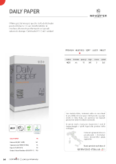 DAILY PAPER Ottime prestazioni per questa carta dall'elevato punto di bianco. Le sue caratteristiche la rendono altamente performante nei grandi volumi di stampa. Certificata PEFC ed Ecolabel. PREMIUM MULTIUSO COPY LASER INKJET codice formato peso gr fogli risme pallet NO05 A4 75 500 5 240 Con Servizio Italia, Comunica offre ai suoi clienti la possibilità di consegnare direttamente ai propri clienti in tutta Italia, con partenza dai depositi presenti in tutto il territorio nazionale. In questo modo si possono risparmiare i costi di magazzinaggio e quelli legati alla gestione della consegna. Comunica provvede alla resa preavvisando i destinatari senza nessun'altra spesa DAILY PAPER 75 aggiuntiva. Bianco CIE (ISO 11475) 161 Spessore mm/1000 (ISO 534) 96 Questo prodotto usufruisce di Opacità % (ISO 2471) 92 Grado di liscio Bendtsen (ISO 8791-2) 190 64 | carte per informare