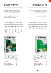 DISCOVERY 75 DISCOVERY 70 Ottime prestazioni nelle grandi tirature Leggera per grammatura ma estremamente grazie alle eccezionali caratteristiche di performante nelle caratteristiche spessore, opacità e stabilità del foglio cui tecniche e di funzionamento. si aggiunge un grado di bianco elevato. Introduce il concetto di eco-efficienza, Introduce il concetto di eco-efficienza, minor utilizzo delle materie prime minor utilizzo delle materie prime ed eccellente macchinabilità. ed eccellente macchinabilità. PREMIUM MULTIUSO COPY LASER INKJET PREMIUM MULTIUSO COPY LASER INKJET codice formato peso gr fogli risme pallet codice formato peso gr fogli risme pallet NT05 A4 75 500 5 240 NT03 A4 70 500 5 240 NT06 A3 75 500 5 120 NT04 A3 70 500 5 120 NT10 A4 75 500 5 300 NT11 A3 75 500 5 150 NT99 A4 75 FAST PACK DISCOVERY 75 75 DISCOVERY 70 70 Bianco CIE (ISO 11475) 161 Bianco CIE (ISO 11475) 161 Spessore mm/1000 (ISO 534) 106 Spessore mm/1000 (ISO 534) 101 Opacità % (ISO 2471) 92 Opacità % (ISO 2471) 91 Grado di liscio Bendtsen (ISO 8791-2) 220 Grado di liscio Bendtsen (ISO 8791-2) 230 | carte per informare 65