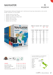 NAVIGATOR Alte grammature della linea Navigator per la realizzazione di ogni tipo di documento a colori ad alta qualità. Certificate FSC ed Ecolabel. ® • Navigator Expression 90 gr | UHD • Navigator Presentation 100 gr | UHD • Navigator Colour Documents 120 gr | UHD • Navigator Office Card 160 gr • Navigator Bold Design 200 gr • Navigator Hard Cover 250 gr PREMIUM MULTIUSO COPY LASER INKJET codice formato peso gr fogli risme LC20 A4 90 500 5 LC21 A3 90 500 5 LC30 A4 100 500 5 LC31 A3 100 500 4 LC40 A4 120 250 8 LC41 A3 120 250 4 LC50 A4 160 250 5 LC51 A3 160 250 4 LC60 A4 200 150 7 LC80 A4 250 125 7 Comunica distribuisce i marchi Navigator e Discovery nelle seguenti regioni: Trentino Alto Adige Marche Umbria Abruzzo Molise NAVIGATOR 90 100 120 160 200 250 Lazio Campania Bianco CIE (ISO 11475) 169 169 169 169 169 169 Puglia Spessore mm/1000 (ISO 534) 115 120 135 184 237 304 Basilicata Opacità % (ISO 2471) min 96 97 98 99 100 100 Sicilia Grado di liscio Bendtsen (ISO 8791-2) 120 100 80 140 170 200 | carte per informare 67