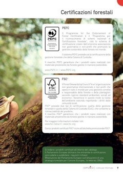 Certificazioni forestali PEFC Il Programme for the Endorsement of Forest Certification è il “Programma per il riconoscimento di schemi nazionali di Certificazione forestale”, cioè lo schema di certificazione creato dall’omonima associazione non governativa e non-profit che promuove la gestione sostenibile delle foreste nel mondo. Il sistema PEFC prevede sia la certificazione della gestione forestale che della Catena di Custodia. Il marchio PEFC garantisce che i prodotti siano realizzati con materiale proveniente da foreste gestite in maniera sostenibile. www.PEFC.it | www.PEFC.org FSC ® ll Forest Stewardship Council è un’organizzazione ® non governativa internazionale e non-profit che opera in tutto il mondo per una gestione corretta e responsabile delle foreste e delle piantagioni secondo rigorosi standard ambientali, sociali ed economici. Garantisce in questo modo la tutela dell’ambiente naturale rispettando i diritti delle comunità locali. FSC prevede due tipi di certificazione: quella della gestione ® forestale e quella della Catena di Custodia (CoC), che consente la rintracciabilità del prodotto. Il marchio FSC garantisce che i prodotti siano realizzati con ® materiale proveniente da foreste gestite in maniera sostenibile. Per maggiori informazioni visitate i siti: www.fsc-italia.it | www.fsc.org Cerca i prodotti certificati FSC vicino all’etichetta promozionale FSC . ® ® Si vedano i prodotti certificati all’interno del catalogo. Il Parlamento Europeo dichiara che entrambe le certificazioni sono adatte a soddisfare i requisiti richiesti. (Risoluzione del Parlamento Europeo sull’attuazione di una strategia forestale per l’Unione Europea, 16 febbraio 2006). | carte per informare 9