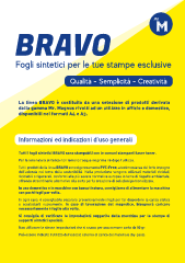 Fogli sintetici per le tue stampe esclusive Qualità - Semplicità - Creatività La linea BRAVO è costituita da una selezione di prodotti derivata dalla gamma Mr. Magnus rivolti ad un utilizzo in ufficio e domestico, disponibili nei formati A4 e A3. Informazioni ed indicazioni d’uso generali Tutti i fogli sintetici BRAVO sono stampabili con le comuni stampanti laser toner. Per la loro natura sintetica non temono l’acqua né prima né dopo l’utilizzo. Tutti i prodotti della linea BRAVO sono rigorosamente PVC-Free, a testimonianza del forte impegno dell’azienda nel tema della sostenibilità. Nella produzione vengono utilizzati materiali riciclati, riciclabili o rigenerati, conformi alle più severe normative europee in tema di rispetto ambientale, offrendo straordinarie alternative alla carta per la creazione di soluzioni personalizzate. In uso domestico e in macchine con bassa tiratura, consigliamo di alimentare la macchina con pochi fogli per volta. In ogni caso, è consigliabile separare preventivamente i fogli per far disperdere la carica statica e accatastarli nuovamente. In caso di lavorazione del magnetico, bisognerà caricare necessariamente 1 foglio alla volta. Si consiglia di verificare le impostazioni suggerite dalla macchina per le stampe di supporti sintetici speciali. Non utilizzare le stesse impostazioni che si usano per una comune carta da 80 gr. Può essere indicato l’utilizzo del vassoio esterno di carico del materiale (by-pass).